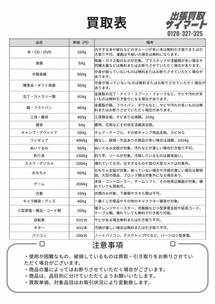 処分に困っている不要品を最短即日でご自宅まで買取に伺います。出張費無料でいろんな品目の商品をまとめて買取いたします。