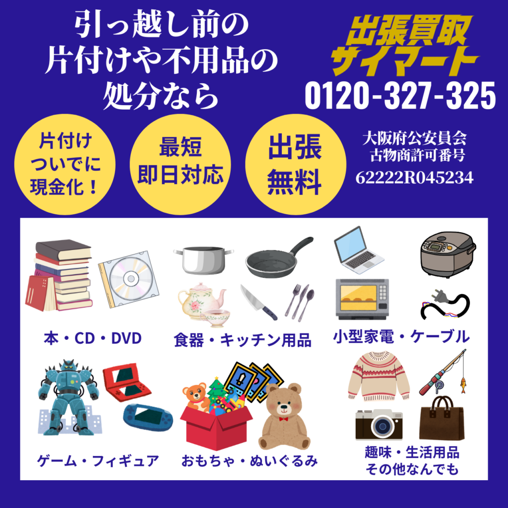 処分に困っている不要品を最短即日でご自宅まで買取に伺います。出張費無料でいろんな品目の商品をまとめて買取いたします。